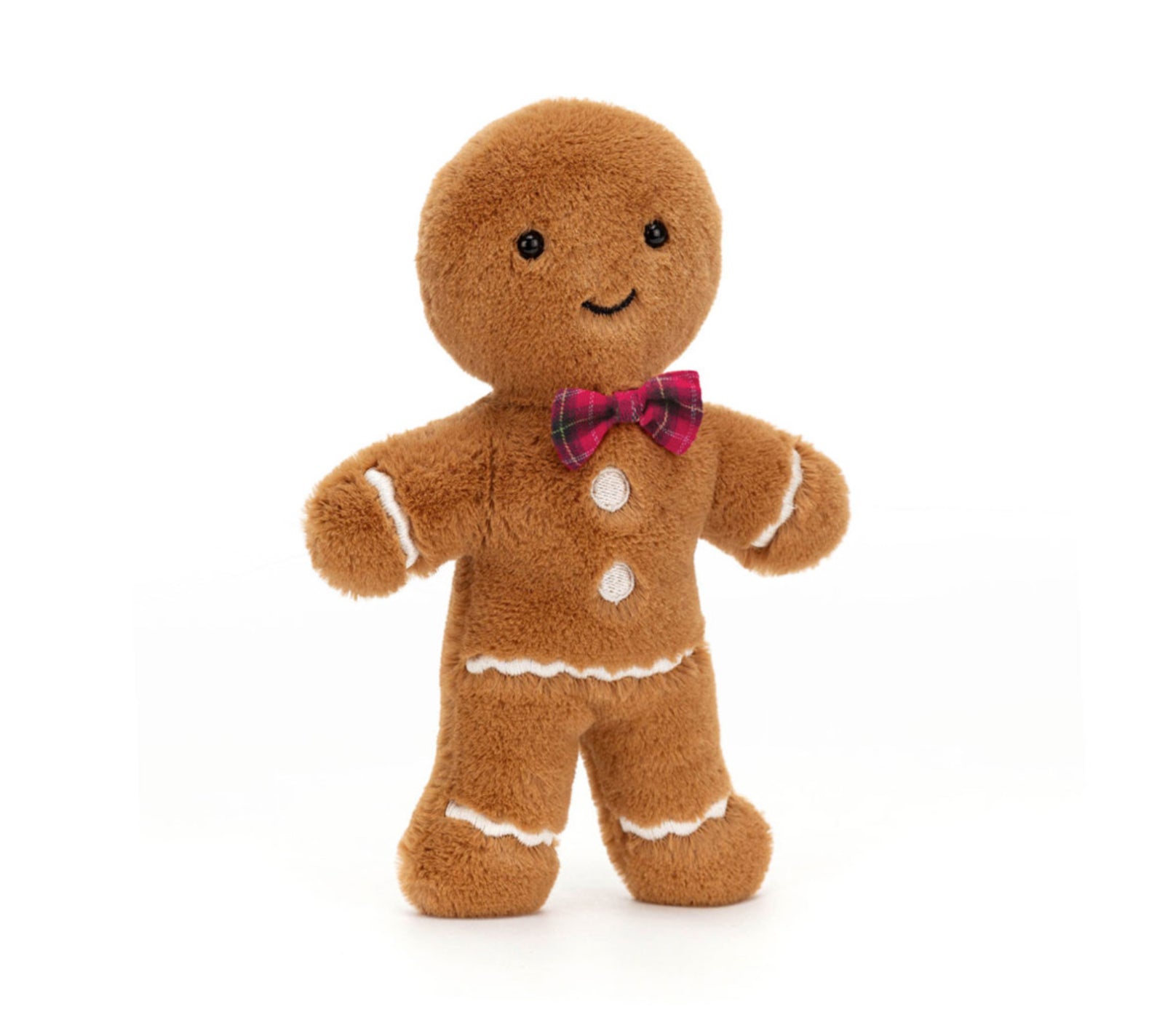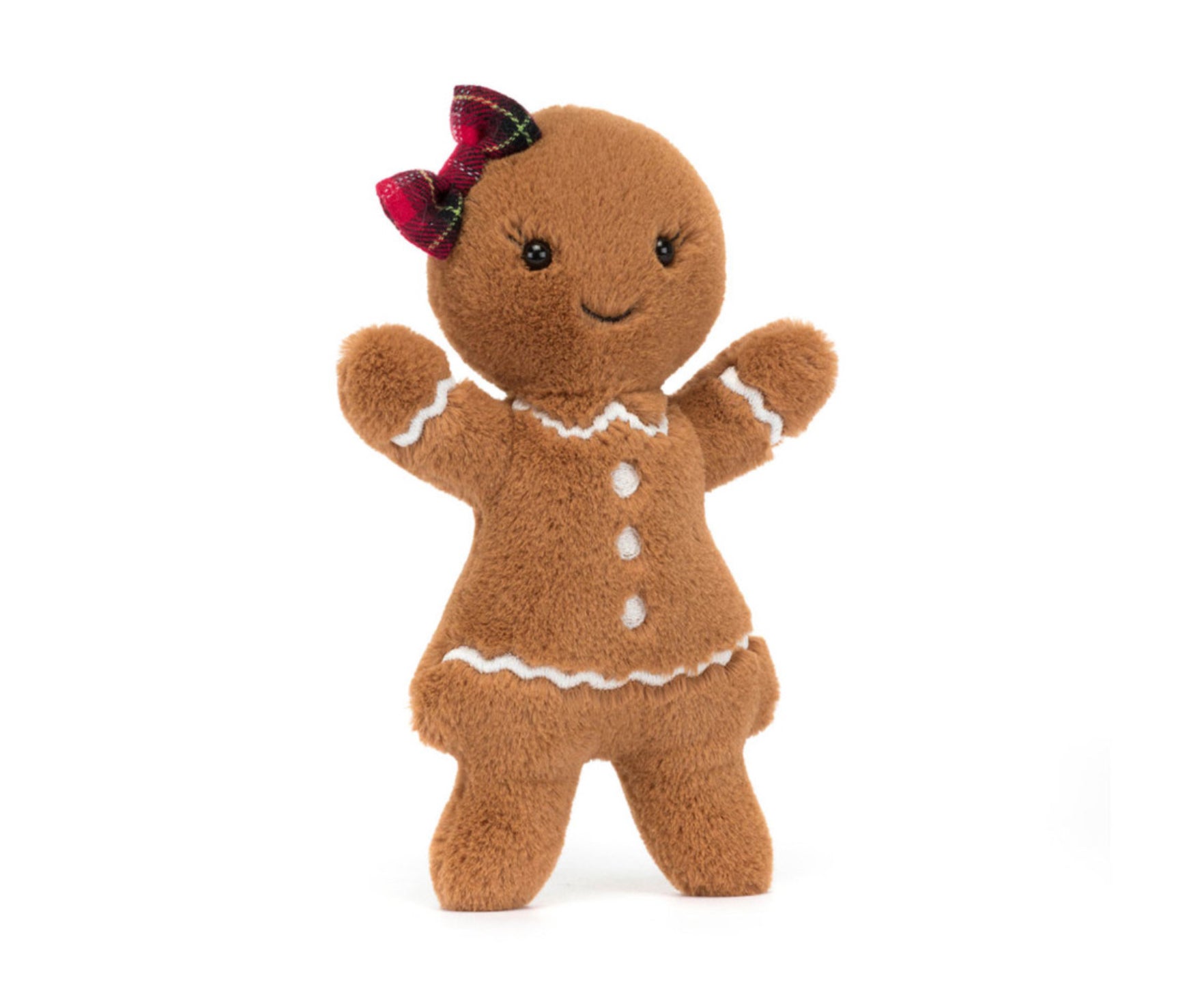 Jolly Gingerbread Ruby can't wait for Christmas! She's all glammed up in a stitched icing dress and her cosy fur is baked to perfection. With embroidered lashes and a tartan hair bow, and biscuit arms aloft, Ruby shines!